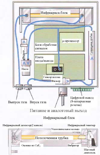потока. Проба газа направляется через камеру для анализа проб, где она